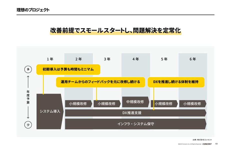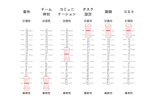 要件、コスト、期間、チーム体制、コミュニケーション方法…さまざまな要素が絡み合うプロジェクト設計において、「計画性」と「柔軟性」の最適なミキシングのバランスを見極めることが重要と語った小橋。ウォーターフォール、アジャイルなどの型を抑えつつも、案件はケースバイケースであるからこそ、常に最適解を考え、チーム全員でプロジェクト「も」デザインするという考え方をお伝えしました。