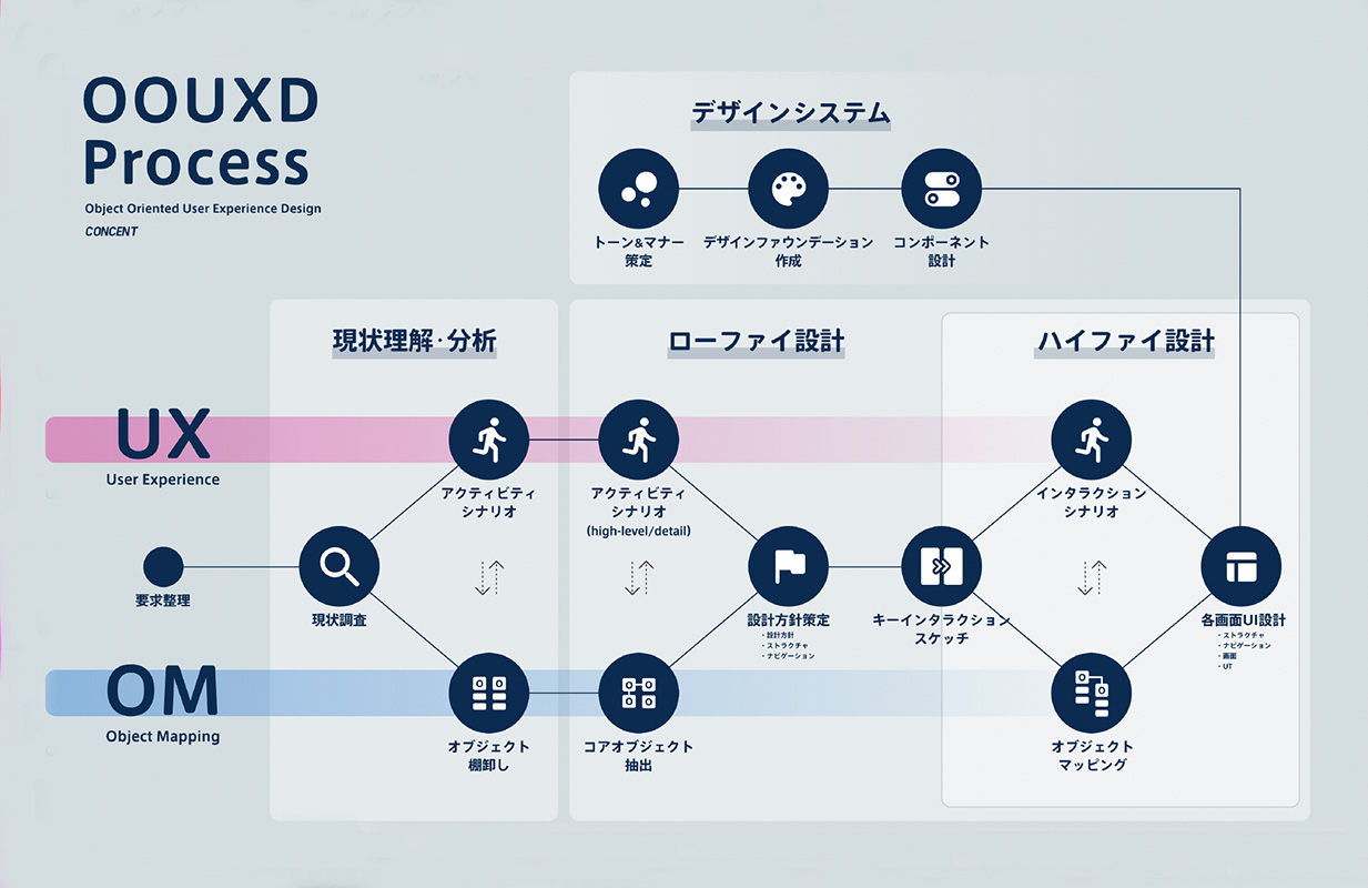 要件定義フェーズでどこまでUIを作り込むべきか判断しづらい、コンポーネントのバリエーションが増えてしまう…など、アプリケーションデザインでぶつかってしまうさまざまな課題をクリアにするため、試行錯誤を続けて辿り着いた、UXとUIをつなぐコンセントなりの「OOUXデザイン プロセス」。プロセスを明確に分割し、各タスクの内容・アウトプット・ゴールをしっかりと言語化して定義するなど、こうやったらよりうまく進められるかも? という学びをまとめ、共有させていただきました。アウトプットの品質を高めるために、業務プロセスや考え方からデザインしていくことの大切さも感じられるプログラムとなりました。
