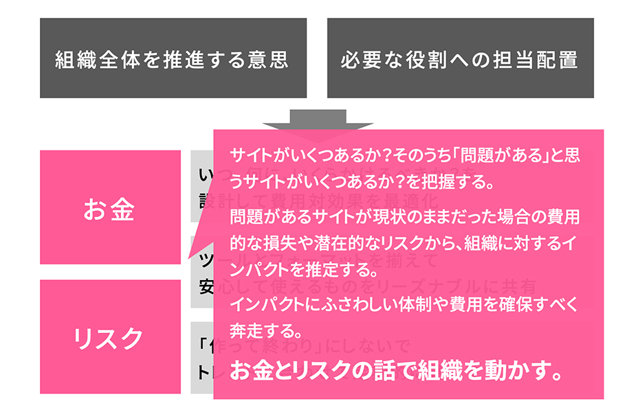 ビジネスにおけるウェブサイトの重要性が増すのに比例して、運営要件が高度化、複雑化する昨今。加川は、従来の「数年に一度、大規模なリニューアルを行う運営」から「作って終わりにせず、トレンドに合わせて定期的に見直す運営」への転換の必要性を説きました。ウェブサイト運営の課題を多重投資などのコスト面、セキュリティなどの法的リスクに大別し、それぞれに最適化するための解決策・実践法をステップに分けて解説。最後は「課題解決の実践には組織全体の理解と協力が不可欠。課題をお金とリスクに置き換えてインパクトを推定することが組織を動かす説得力になる」と締めくくりました。