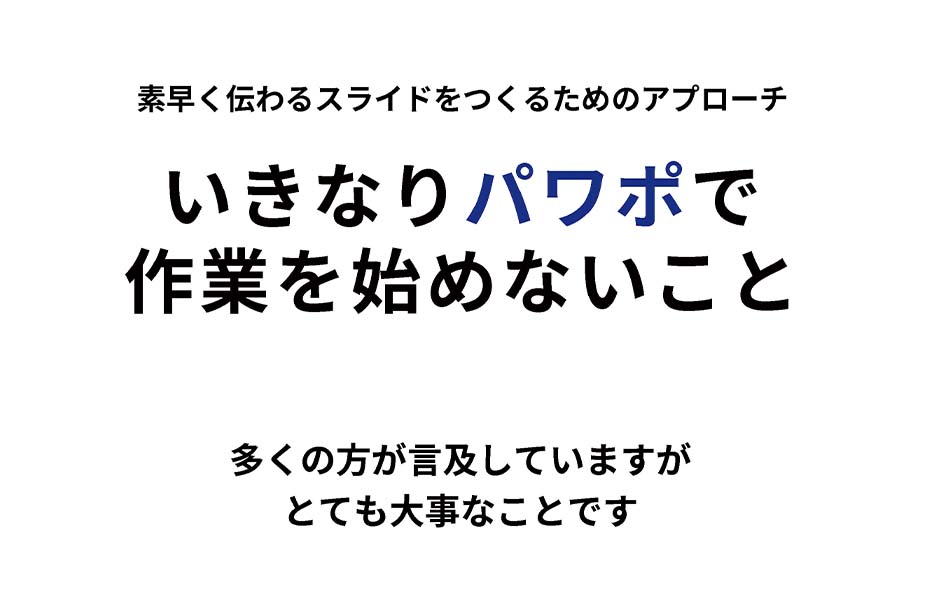 具体的なノウハウもあり、分かりやすかったです。 はじめに、いきなりパワポで作業をしないこと、が出てきたときドキッとしました。まさに私のことだなと。 PC上で作業したほうが早くできる気がしてましたが逆だったんですね。 今日のプログラム内容、少しずつ試してみようと思います。 ありがとうございました。