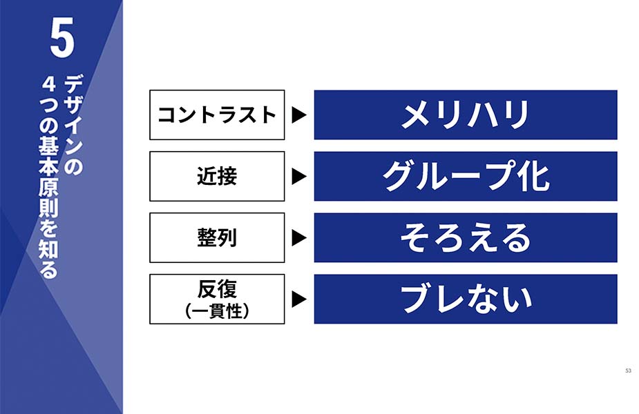 PowerPointを使った実例が良かったです。わかりやすい説明で、デザイナーではない人でもどこを意識すればいいのかがわかると思いました。