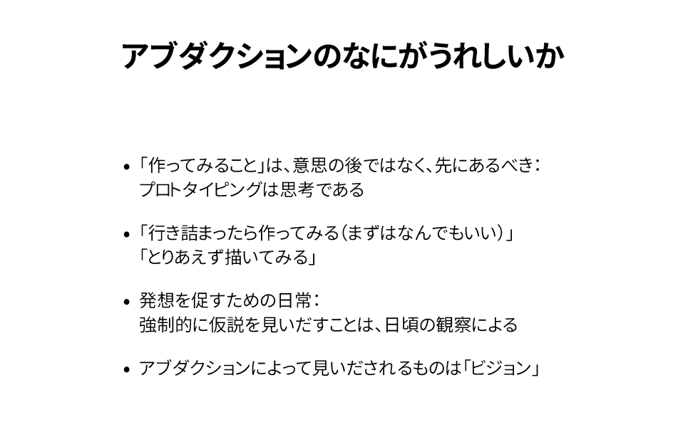質疑応答の部分が、リアルで非常に参考になった。特に、収束させていく過程をうまくまとめていくには、ファシリテーター自身が面白いと思った軸を大事にして、積極的に議論の中でぶつけていくと議論が進みやすくなるという話が参考になった。また、最大公約数的な結論になるのを避けるには、巻き込むメンバーの順番も重要という話が非常に実践的で納得感があった。