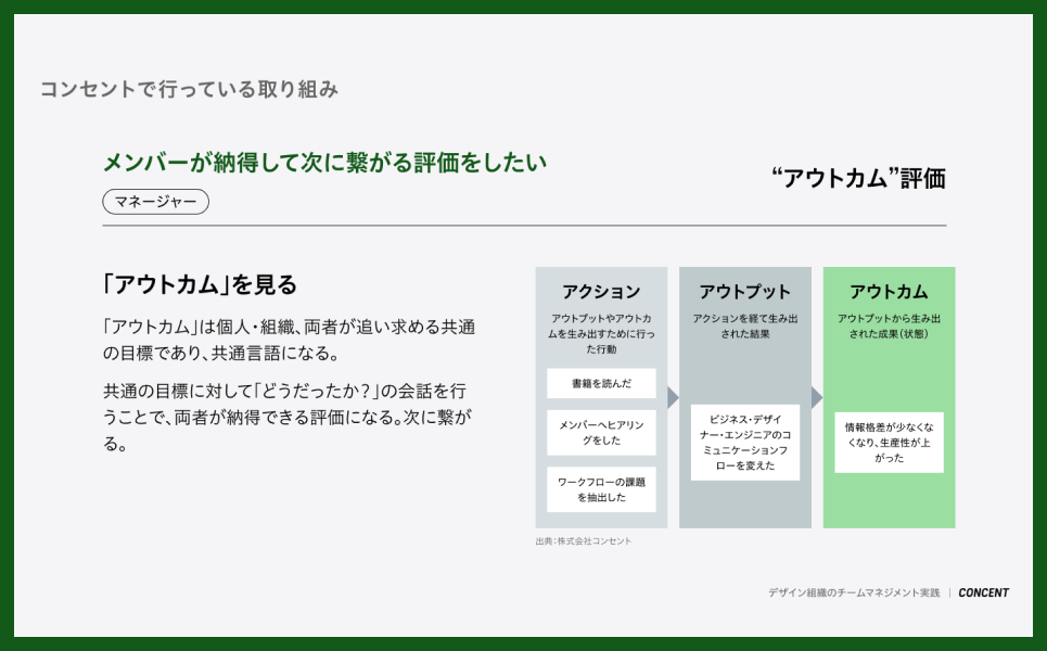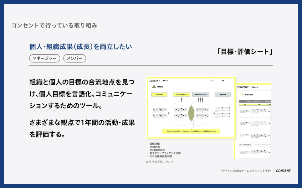 コンセントの User Experience Design Group のマネージャーとして、デザイナーやエンジニアなど20名近くのメンバーを束ねる黒坂が登壇。まず自社の人材育成や評価といった組織制度について説明した上で、自身や組織で取り組んでいるチームマネジメントの方法と実践例を紹介しました。専門性が異なるメンバーを適切に評価するための目標設計や考え方、目標達成に向けて個人の主体的な行動を引き出す方法など、一般的なフレームワークを元に試行錯誤し自社なりに昇華させた実践例を共有。多様な組織の形がある中で、自分たちならどう最適化できるか?参加した皆さんのヒントとなれば幸いです。