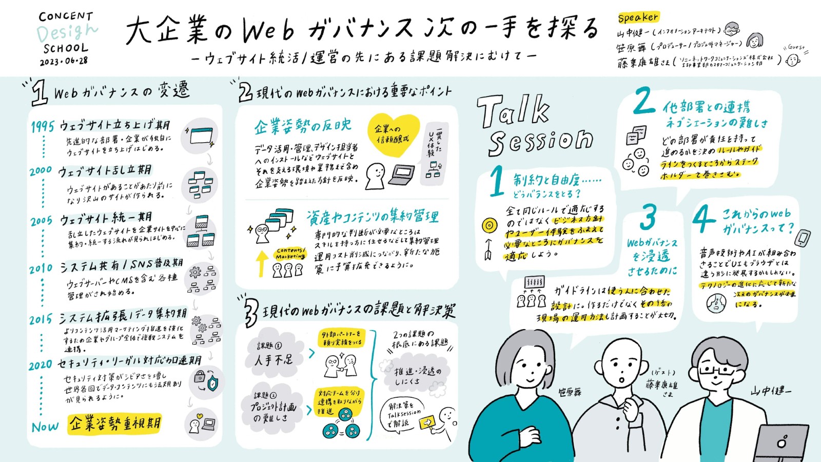 企業のウェブサイト群を統括・運営・活用する際の要となる「Webガバナンス」について、基礎知識から課題解決のヒントまで幅広くお伝えした本プログラム。前半はWebガバナンスの変遷を振り返りつつ、今のWebガバナンスで重要となるポイントを「企業姿勢の反映」と「資産やコンテンツの共用」であると解説。それが企業への信頼醸成や業務効率化につながるとお伝えしました。後半はWebガバナンスの重要性を組織へ浸透させるための策について、ゲストスピーカーの藤乗康雄氏とともに鼎談形式で議論。スピーカーそれぞれの経験から得た気づきなどを共有しました。参加者からは「そもそもWebガバナンスとは…という振り返りや、具体的なエピソードを交えてお話いただけたため、とても参考になりました」といった声をいただきました。