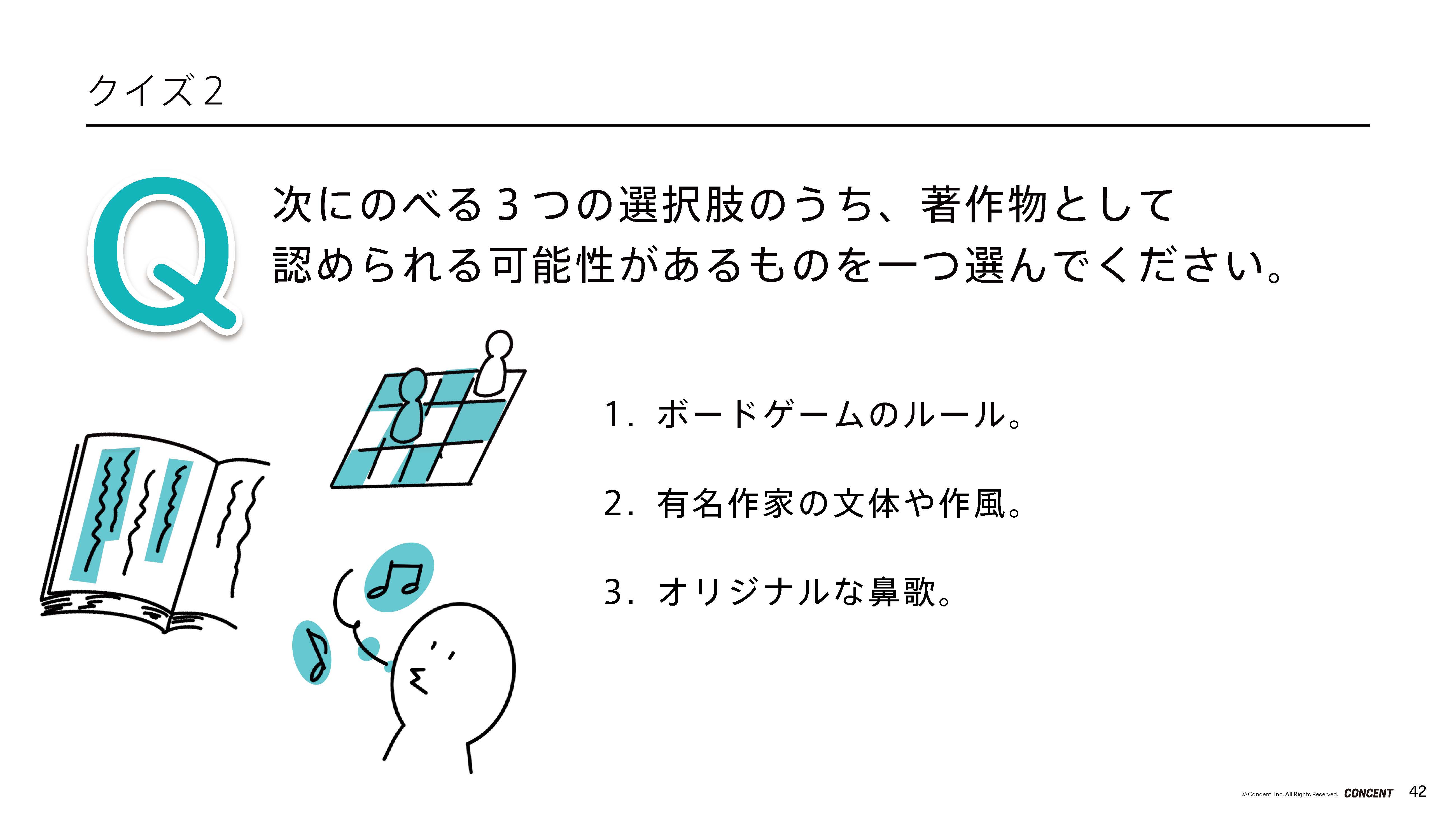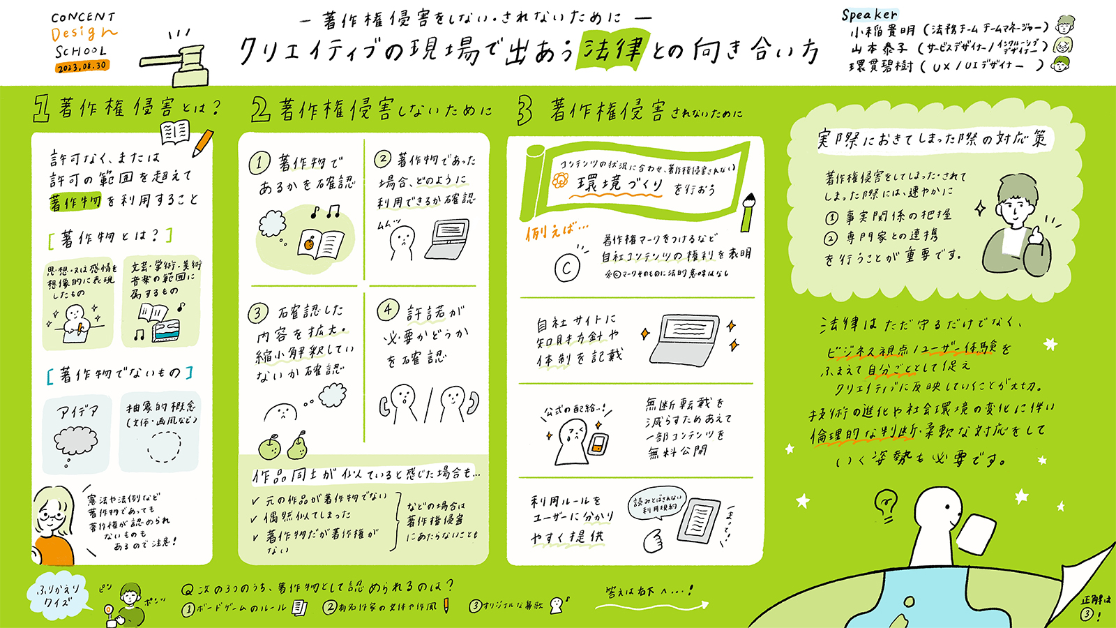 クリエイティブの現場に潜む著作権侵害などの法律問題に「自分ごととして向き合う」ことを目的とした本プログラム。クイズの出題やケーススタディの紹介を通して、参加者の皆さまとコミュニケーションを取りながら和やかにお届けしました。講師は、コンセントの法務担当と多くのプロジェクト推進をしてきたデザイナー。プログラム中に寄せられた質問に、それぞれの立場と経験から培った考えをたっぷりお伝えしました。法律を単に守るべき「ルール」と捉えたり、専門家に任せるだけにせず、ビジネス観点や倫理的判断も取り入れて自分視点で考えることの大切さに気づける回となりました。